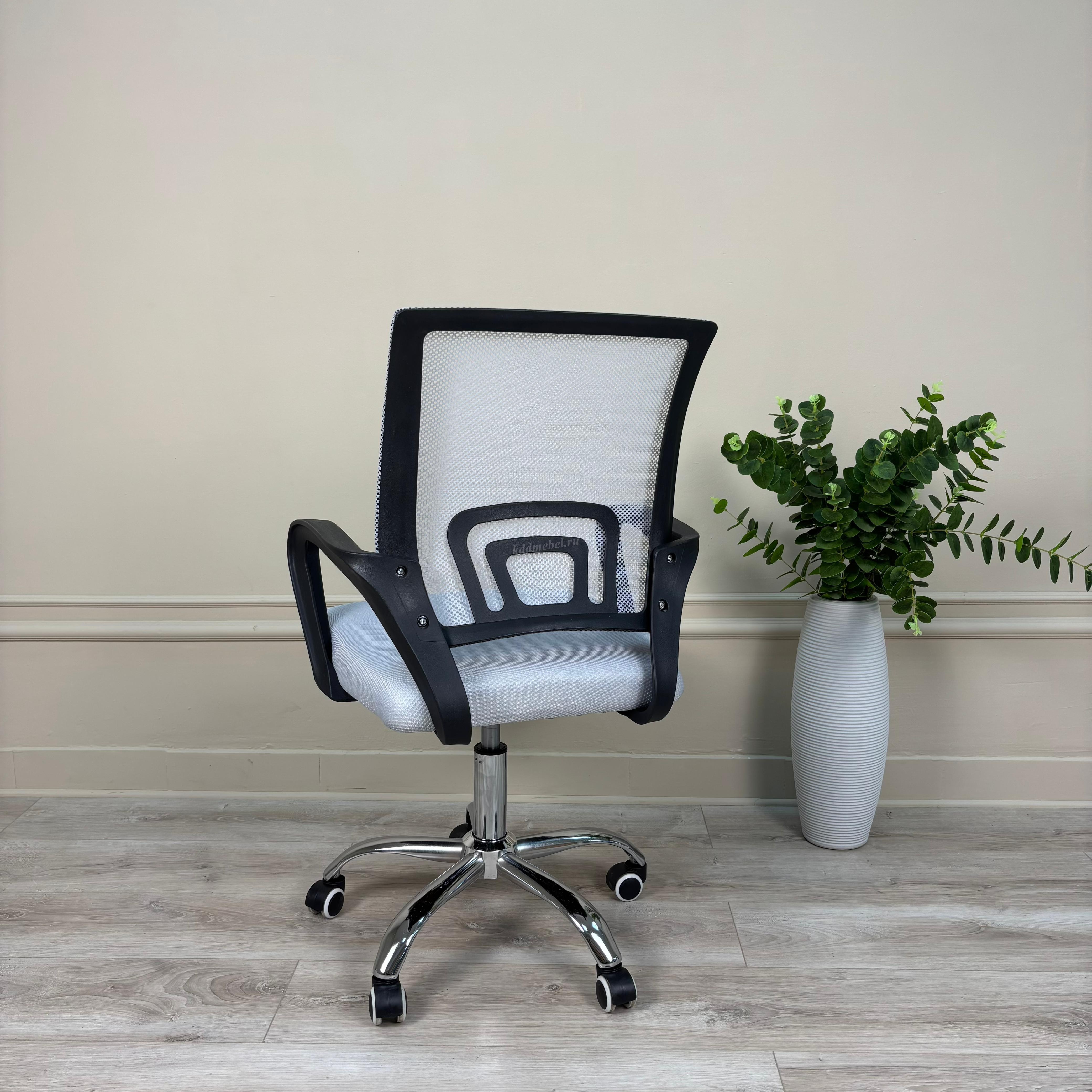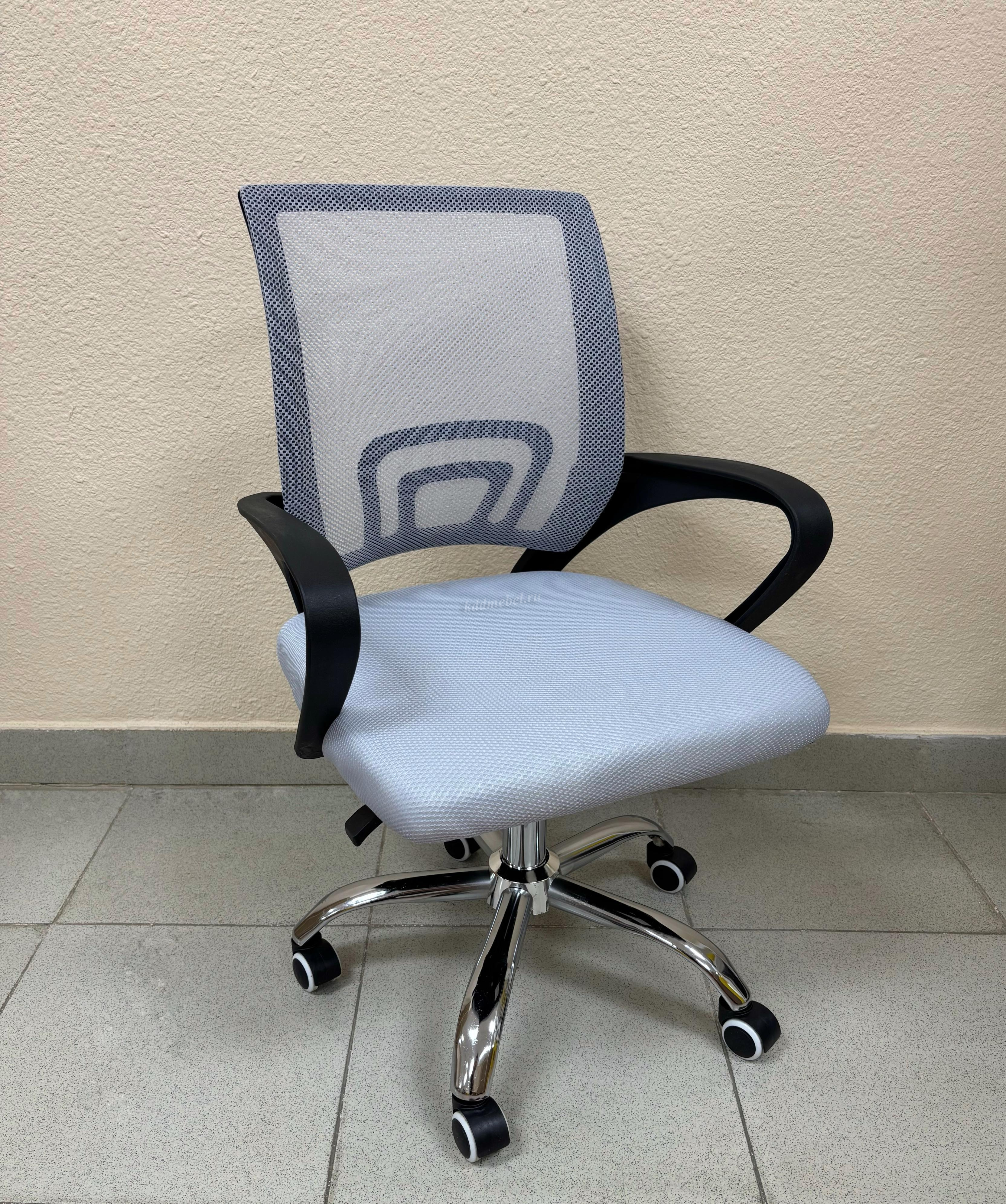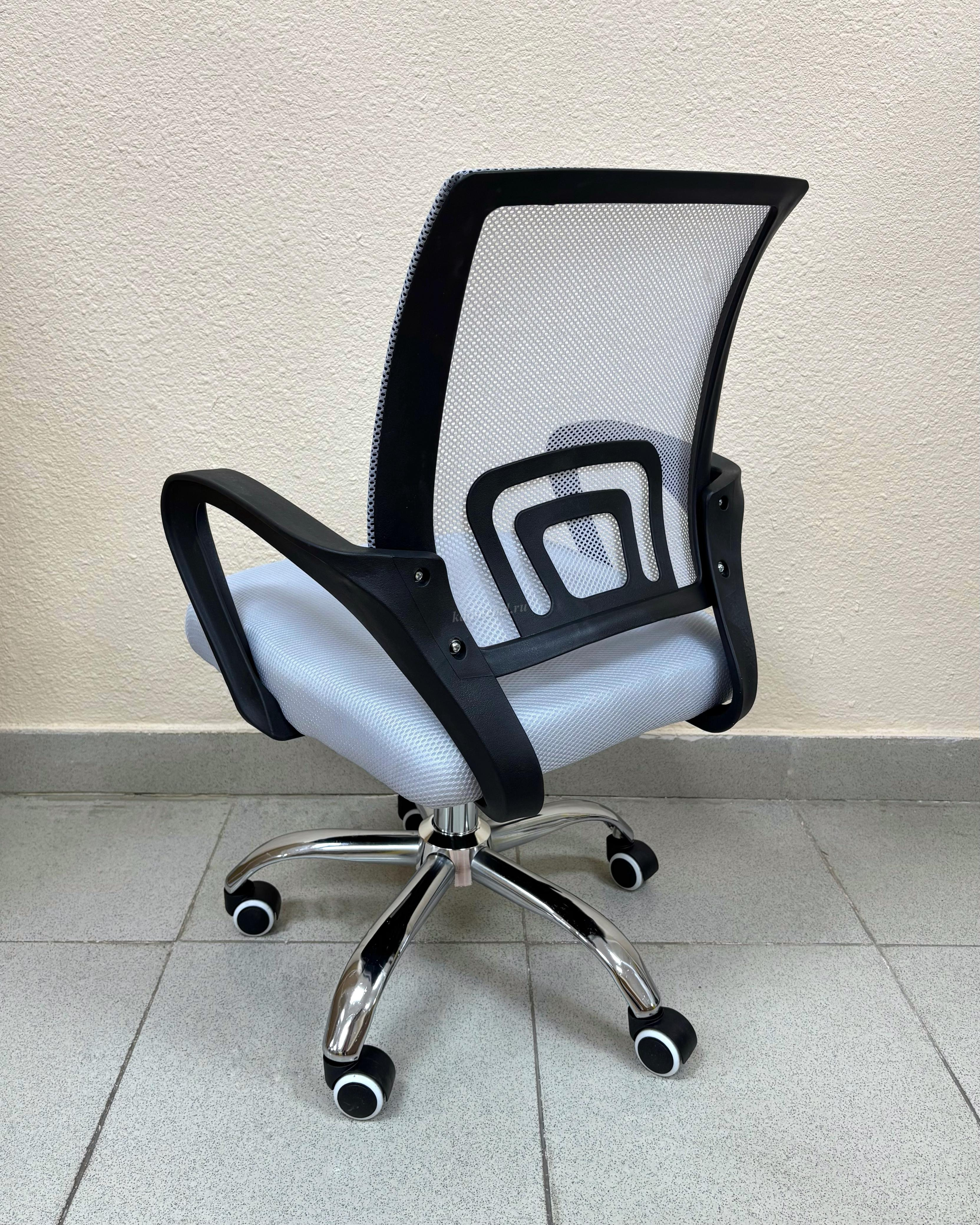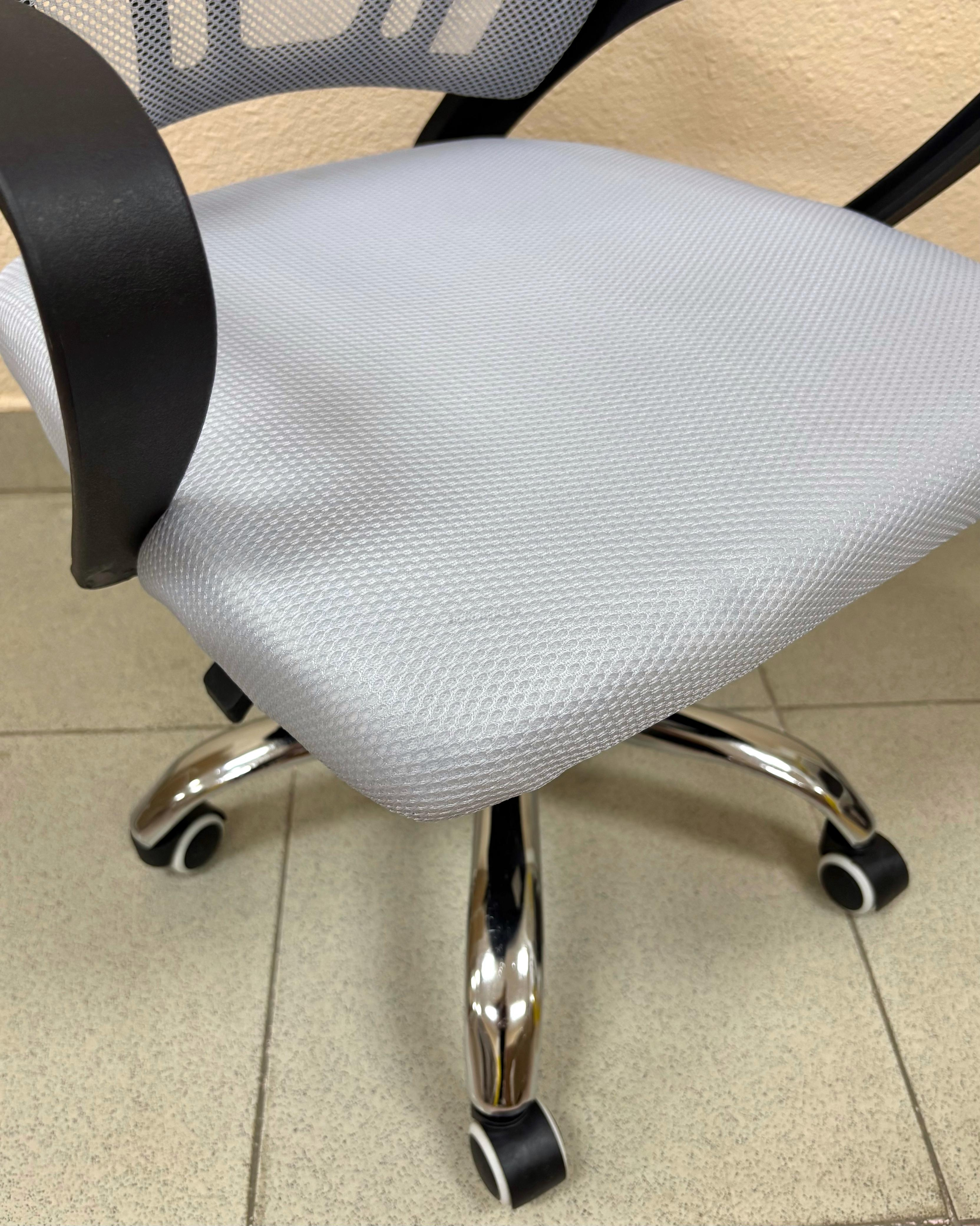 Современное офисное кресло с удобной спинкой, сиденьем из акриловой сетки и устойчивым пятилучным хромированным основанием, снабжённым 50-мм двойными колёсиками.