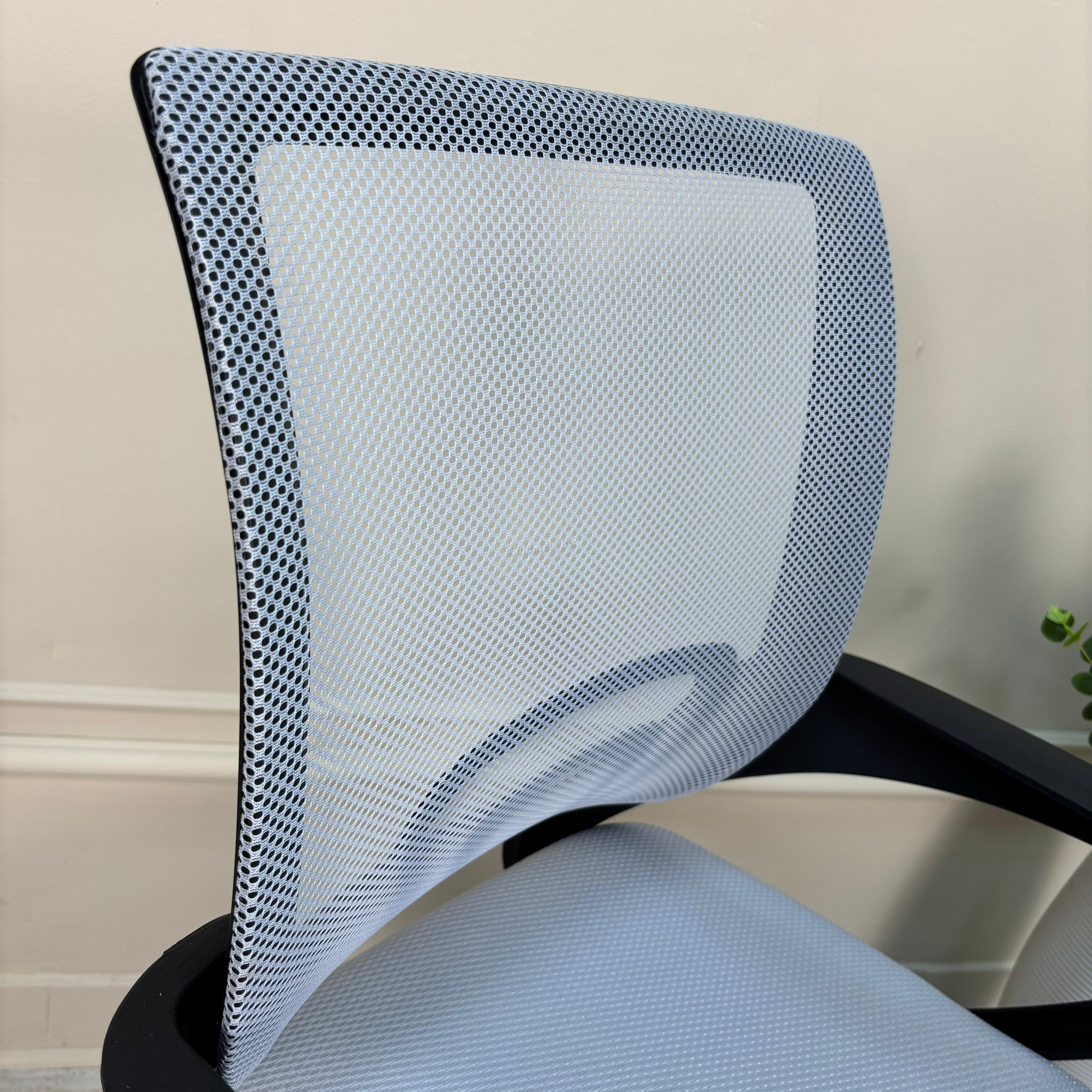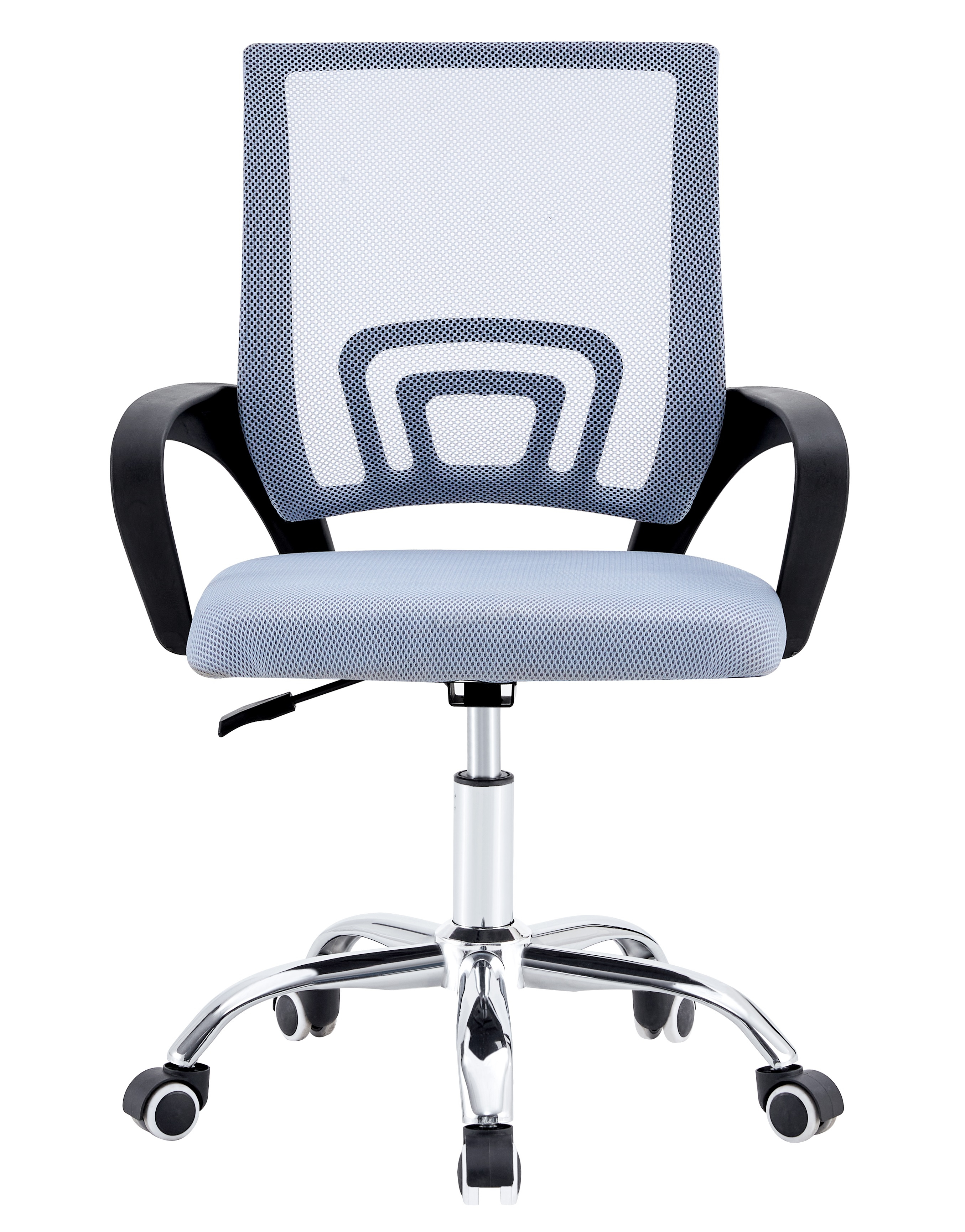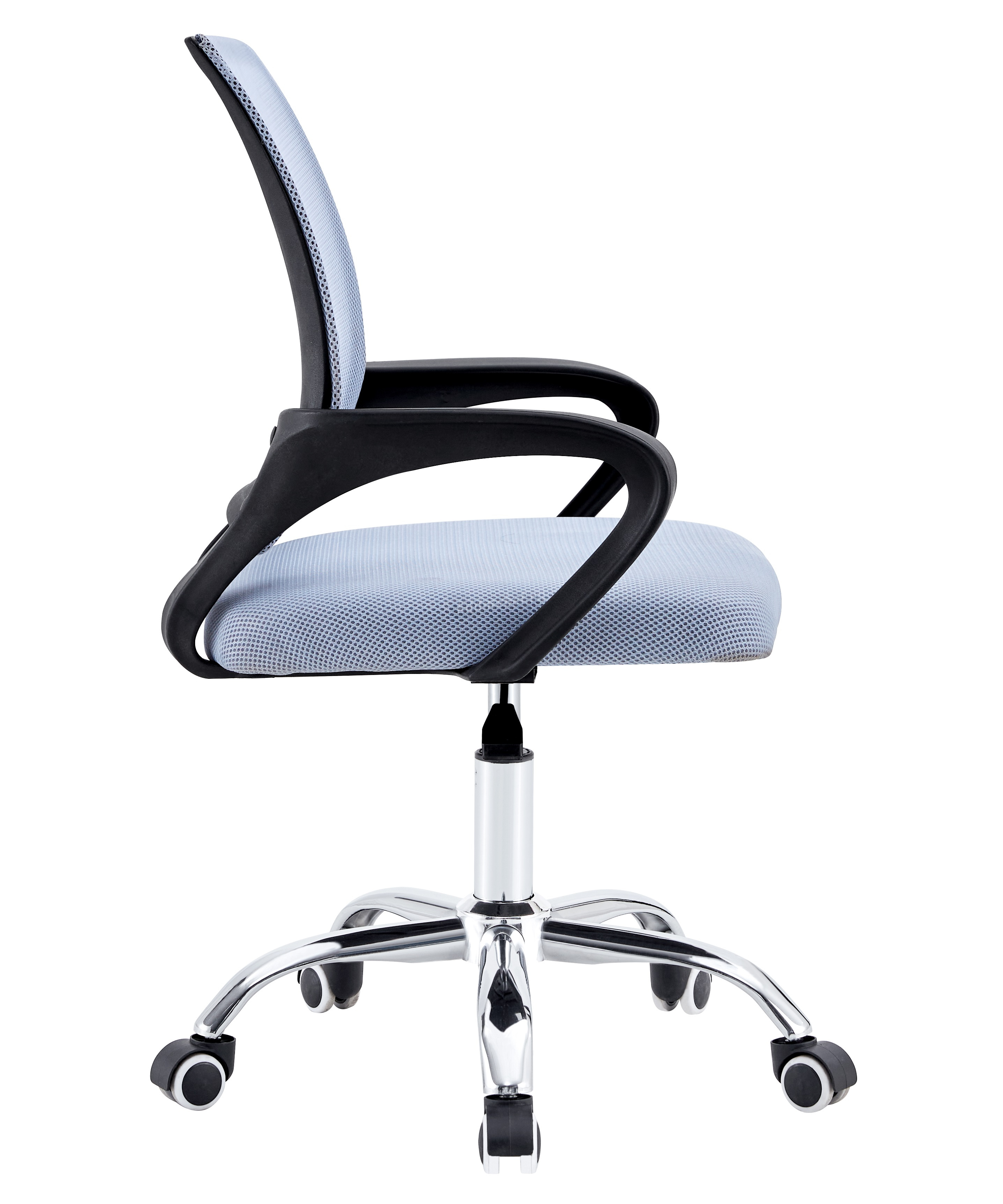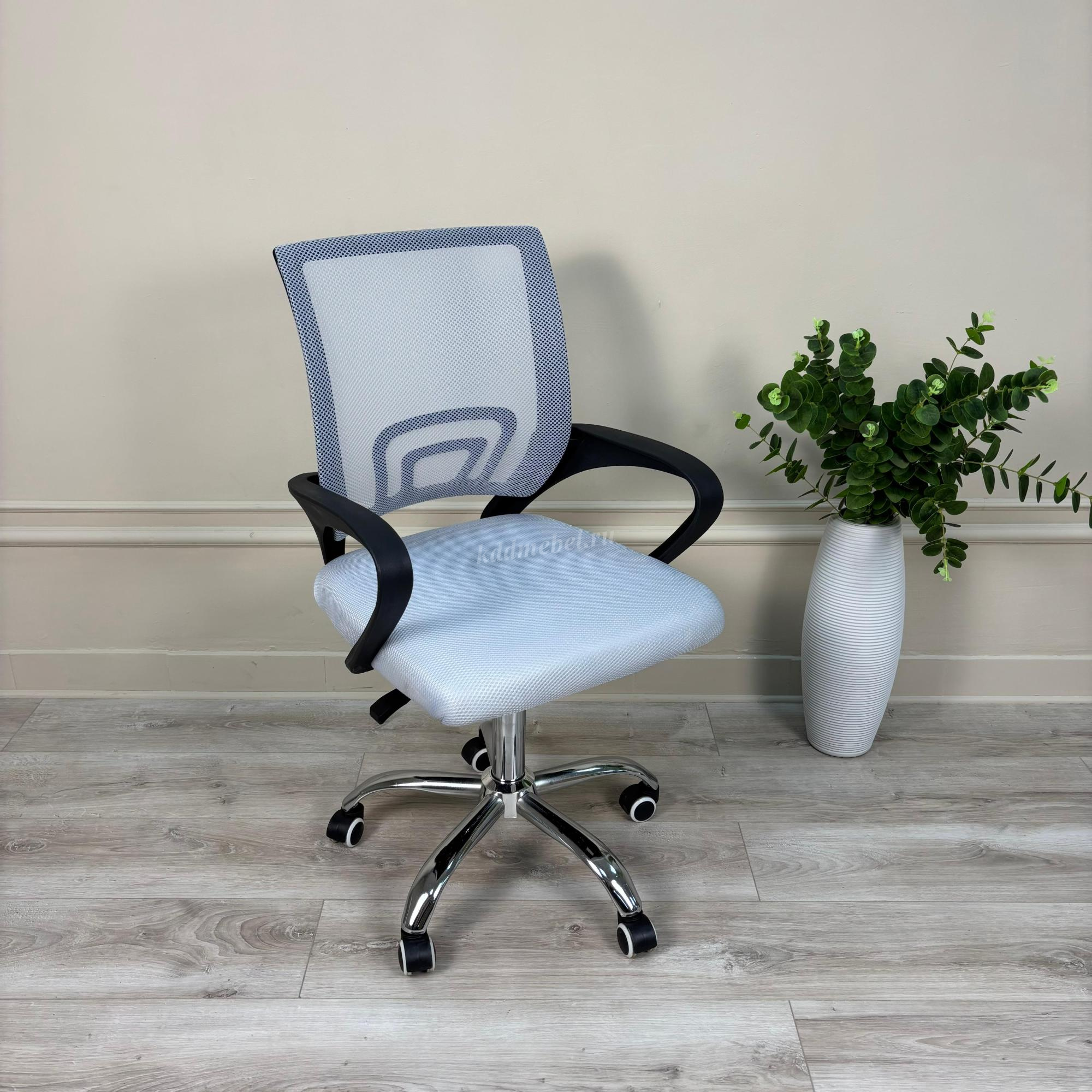 Современное офисное кресло с удобной спинкой, сиденьем из акриловой сетки и устойчивым пятилучным хромированным основанием, снабжённым 50-мм двойными колёсиками.