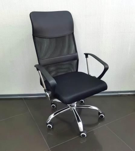 Современное офисное кресло с высокой спинкой, сиденьем из сетки и устойчивым пятилучным хромированным основанием,