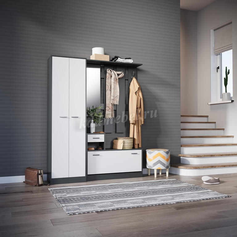 Интер – современная прихожая в стиле минимализм - минимум декора, максимум функционала. Компактная и вместительная, с небольшой глубиной – она поможет правильно организовать пространство в небольшом помещении. Прихожая включает в себя необходимые модули: вешалка с крючками, вместительные обувницы, выдвижные ящики для мелочей, зеркало.