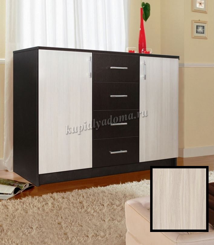Комод имеет два больших отделения за распашными дверцами, разделенные внутри на 2 просторные полки. Посередине модели расположены четыре выдвижных ящика для разных мелочей. Дверцы открываются в сторону. Ящики выдвигаются на себя.