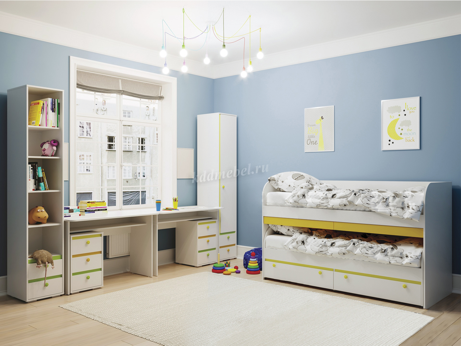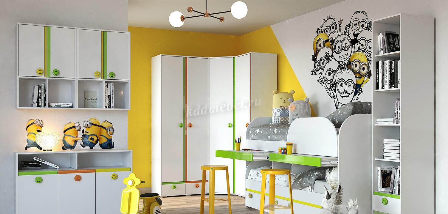 Современная детская коллекция Мамба – это насыщенность красок, простота форм и возможность трансформации. Особенность коллекции – это эффектный контраст цветов: белый фасад с ярко-желтым, оранжевым и зеленым декором. Он позволяет воплощать самые необыкновенные и смелые идеи. Интерьер изобилует множеством секций для хранения вещей, игрушек, книг. Все необходимое Вы можете разместить в пеналах с закрытыми и открытыми полками, шкафах, многофункциональных тумбах, навесных антресолях из коллекции Мамба. Дав волю фантазии, можно сформировать уникальный интерьер. Очень эффектно и игриво смотрятся ручки в виде «смайлов» в цвет декора коллекции.