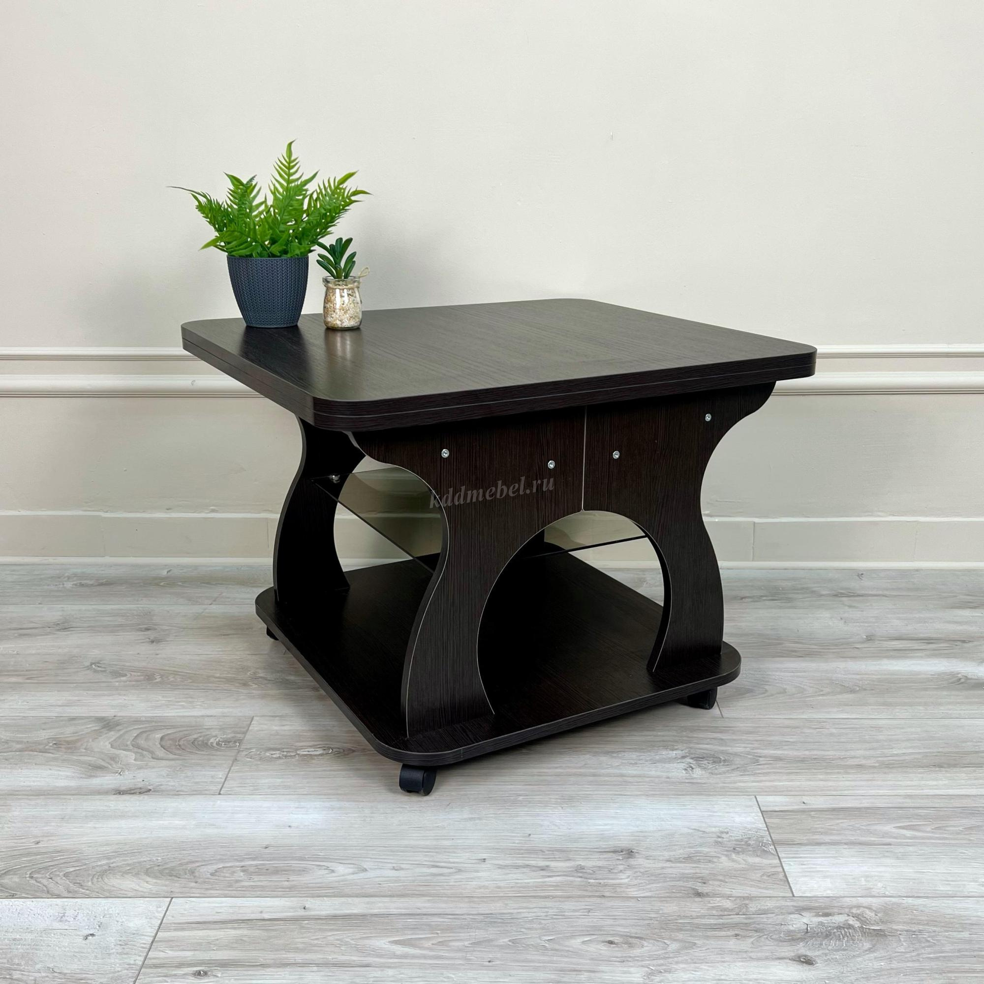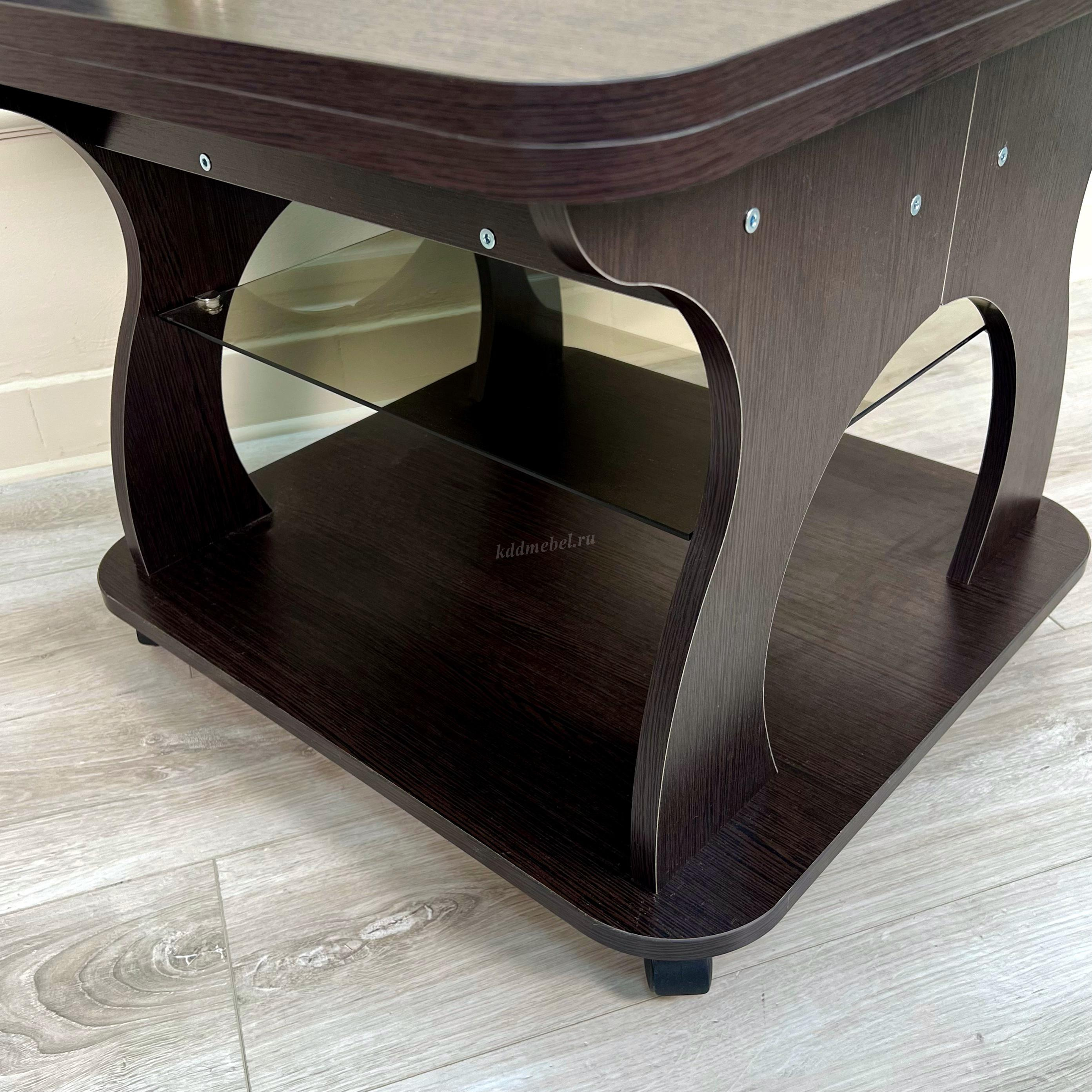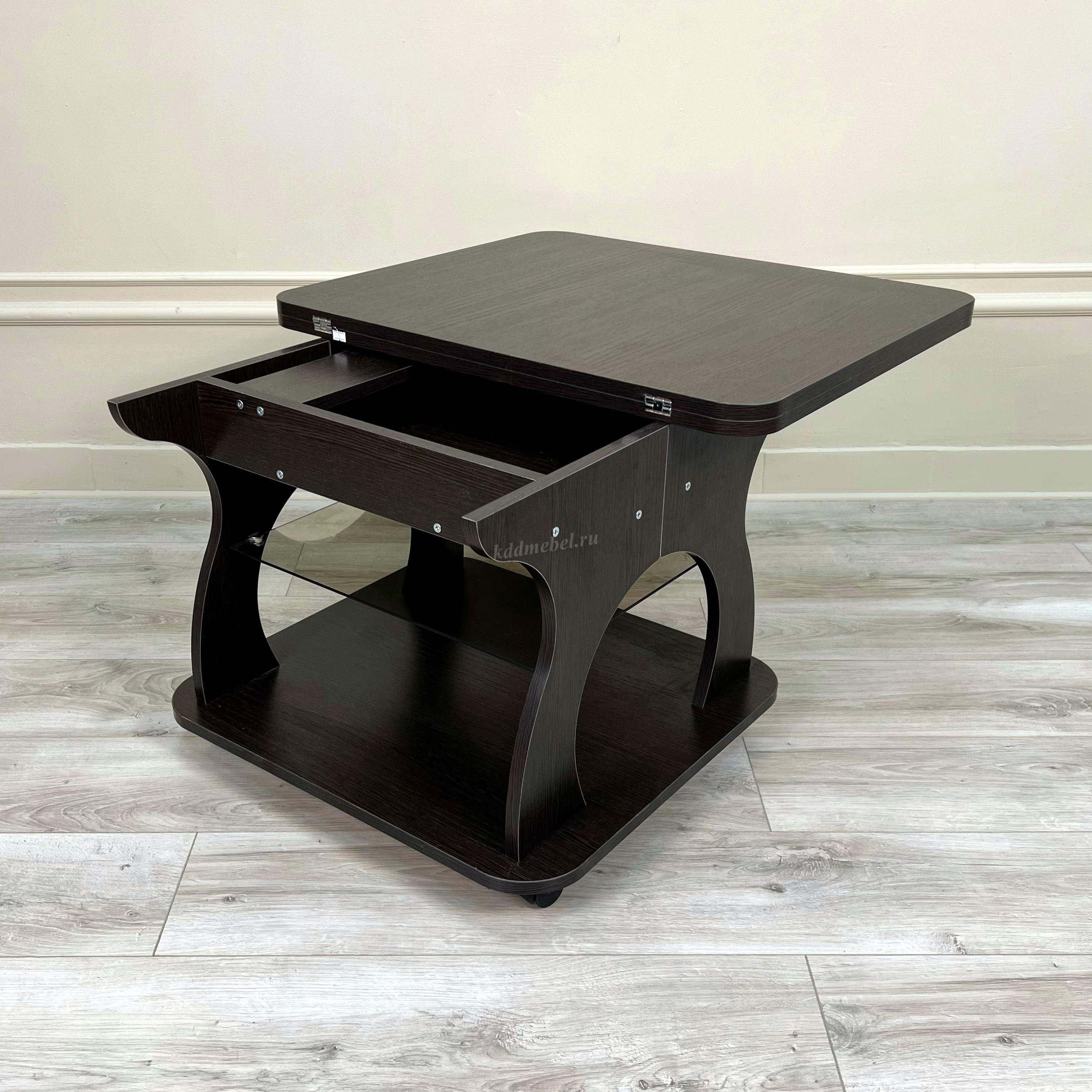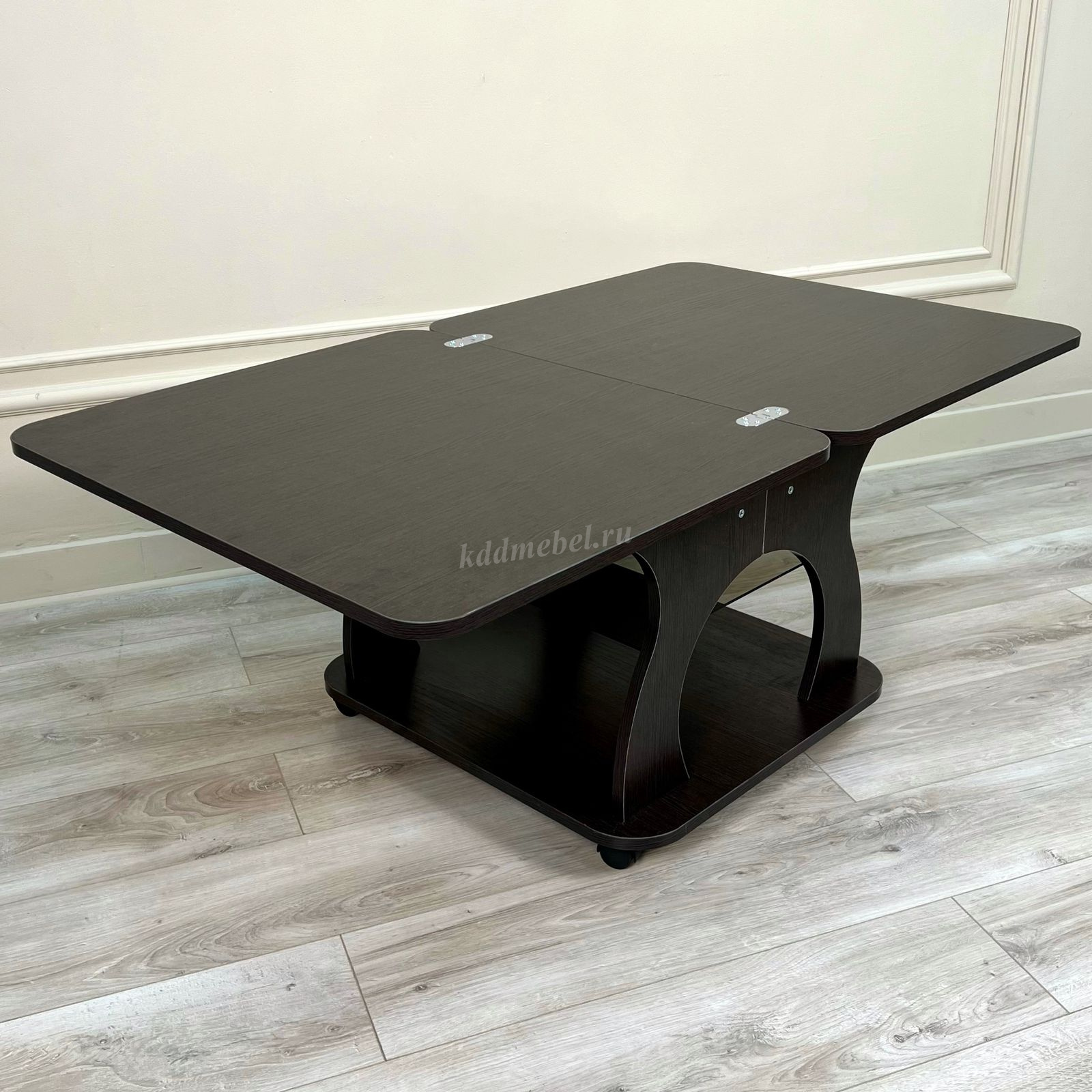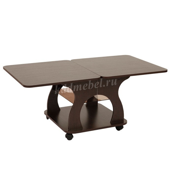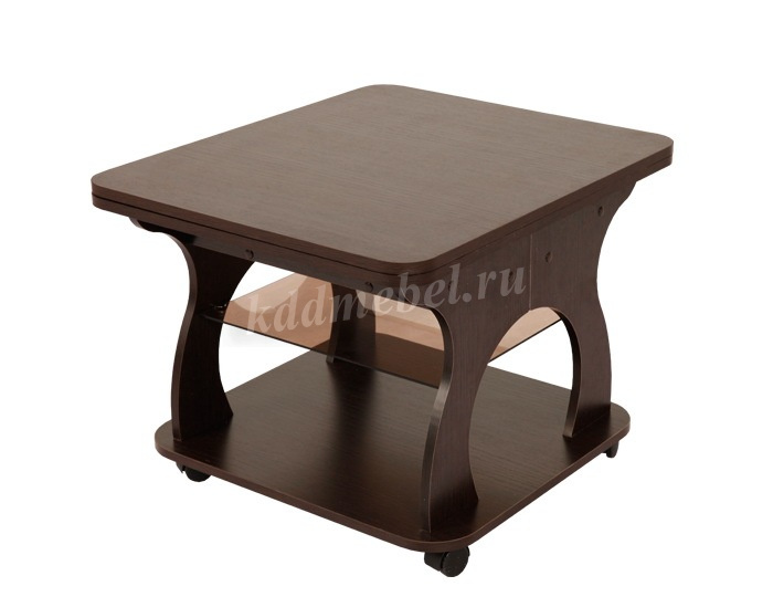 Ответ : Здравствуйте. Стол журнальный раскладной "Купер" имеет прямоугольную форму с чуть закругленными углами крышки стола. Это раскладная модель, что позволит вам увеличить размер журнального стола в два раза. Для этого вам потребуется только откинуть одну половину крышки стола.При разложении стол получается большой, что позволит свободно усадить за него до 12 человек. Под основной крышкой стола имеется стеклянная полка для газет, книг, журналов и пультов. Интересный изгиб "ножек" придает столу оригинальный вид. Стол журнальный раскладной "Купер" на роликах, поэтому вы сможете легко и свободно передвигать его по всей комнате.